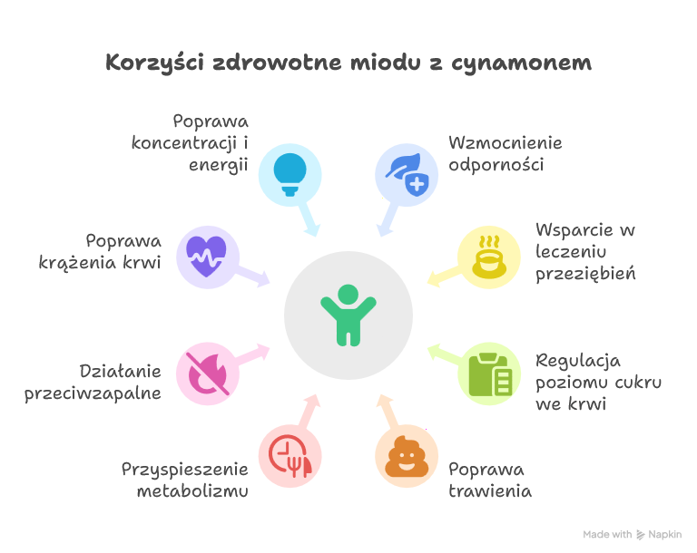 Miód z cynamonem to połączenie dwóch naturalnych składników o silnym działaniu prozdrowotnym. Miód dostarcza enzymów, antyoksydantów i łatwo przyswajalnych cukrów, natomiast cynamon zawiera substancje przeciwzapalne, przeciwbakteryjne i regulujące poziom cukru we krwi. Taka mieszanka wspiera organizm w walce z infekcjami, poprawia trawienie i może korzystnie wpływać na układ krążenia.