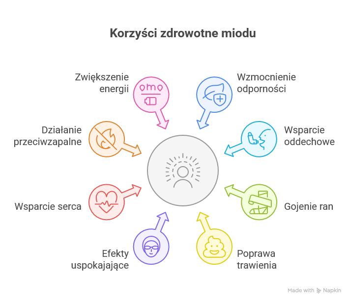 Miód, jako naturalny produkt pszczeli, wykazuje szerokie spektrum działania wspierającego organizm. Jego właściwości wynikają głównie z obecności cukrów prostych, enzymów, antyoksydantów, kwasów organicznych i mikroelementów. W zależności od rodzaju, może być stosowany w różnych celach profilaktycznych i wspomagających leczenie.